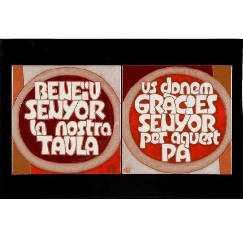 Ref. 102961 unitats Mida del quadre: 45 x 30 cm. Rajoles pintades "a la gota" i cuites a baixa temperatura fins a 960º. S'acaba la peça amb un suport de fusta.