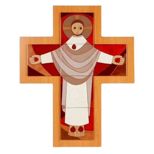 Creu de 6 rajoles pintades a la gota i cuites a baixa temperatura fins a 960º. S’acaba la peça amb un suport de fusta.